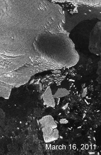 Analizadas las imágenes obtenidas y puestas en movimiento secuencial se observó cómo producido el terremoto de Tohoku - Japón, el tsunami levantó enormes olas que se desplazaron hacia la Antártida, 8.000 millas (13.600 km) de distancia, y “cerca de 18 horas después de ocurrido el terremoto, las olas rompieron varios trozos de hielo que en conjunto equivalía a dos veces la superficie de Manhattan”, informó la NASA.